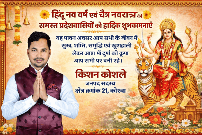 कोरबा। हिंदू नव वर्ष एवं चैत्र नवरात्रि के पावन अवसर पर कोरबा जिले के क्षेत्र क्रमांक 21 (तिलकेजा) के जनपद सदस्य किशन कोशले ने समस्त प्रदेशवासियों को हार्दिक शुभकामनाएं दी हैं। उन्होंने अपने संदेश में कहा कि यह नववर्ष सभी के जीवन में नई ऊर्जा, […]