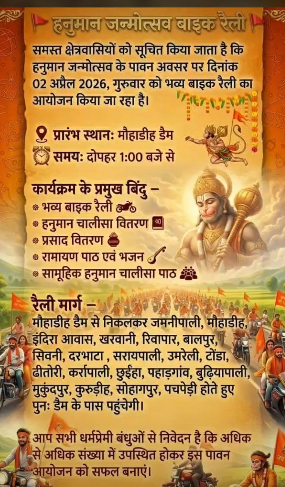 मौहाडीह। हनुमान जन्मोत्सव के पावन अवसर पर 02 अप्रैल 2026, गुरुवार को क्षेत्र में भव्य बाइक रैली का आयोजन किया जा रहा है। इस आयोजन को लेकर क्षेत्र में उत्साह और धार्मिक माहौल देखने को मिल रहा है।